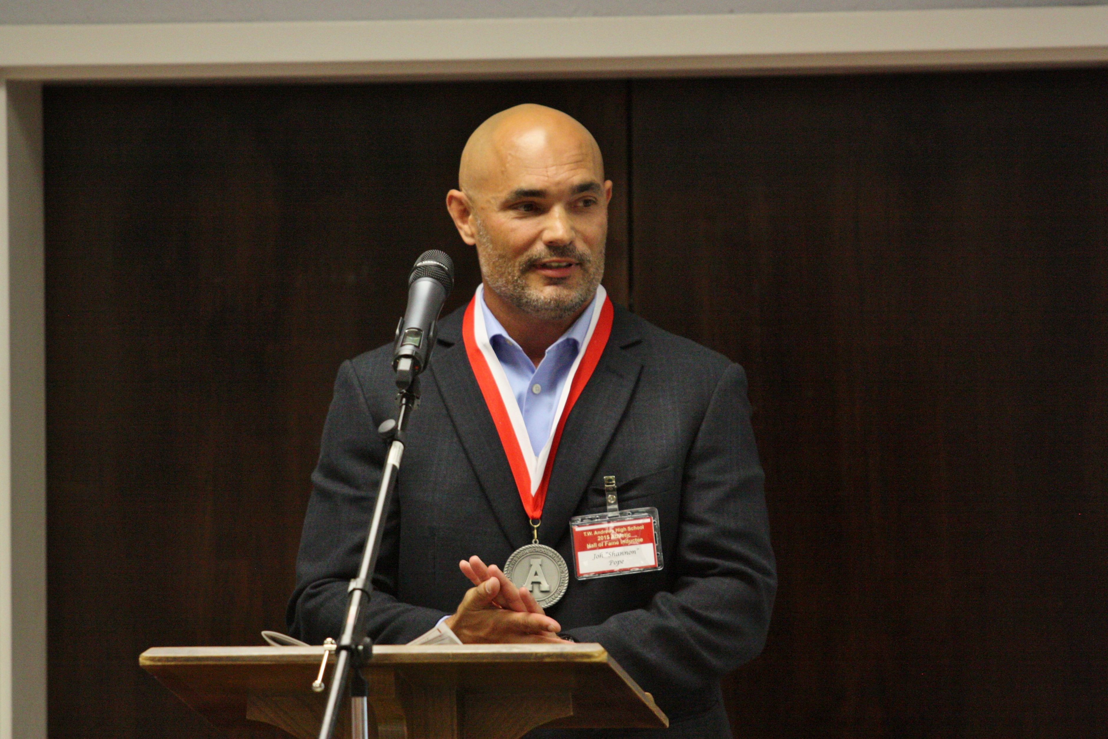 JJ McQueen was an outstanding three-sport athlete at Andrews. He competed in the high jump and triple jump in track, but it was in football and basketball that he made his mark. He was the team Captain his senior year on the 1995 basketball team that won the 3A State Championship, the first ever for Andrews basketball. He is still the TWA all-time leading rebounder. JJ was a tight end and defensive end in football and was named All-State and Honorable Mention All-American his senior year. He played in the 1994 Shrine Bowl and the 1995 East-West All-Star game. He earned an athletic scholarship to East Carolina and played both football and basketball, lettering three times in each sport. In the final football game of his senior year, he caught eight passes for 108 yards and two touchdowns. He graduated in 1999 with a degree in Broadcast Journalism and went on to play seven years in the Arena Football League.