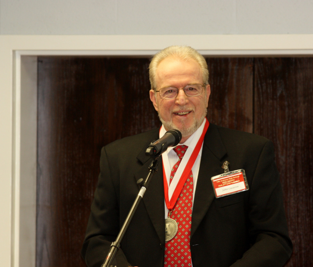 John Casazza enjoyed a 32-year career as teacher, coach and athletic director at Andrews. This New Jersey native is a 1972 graduate of East Carolina and started at quarterback at for two years. He was named the Outstanding Player at ECU for the 1971 season. In 1975, John was hired to coach football and tennis at Andrews. He served as an assistant football coach for 20 years, during which time Andrews won 14 conference and two state championships. John served as Interim Head Coach in 1994. Inheriting a tennis team that finished 0-16 the year before he arrived, he developed Andrews into a perennial state power. During his 25 years as head coach he produced 10 conference and five regional championships and his teams finished as state runner-up on five occasions. He was named Conference Coach of the Year seven times. John also assisted in wrestling and basketball, and served as Athletic Director during the final four years of his tenure at Andrews. Upon his retirement in 2007, the school honored him by creating the John Casazza Award which goes each year to a senior athlete with exceptional drive and determination.